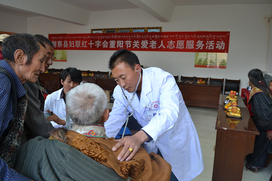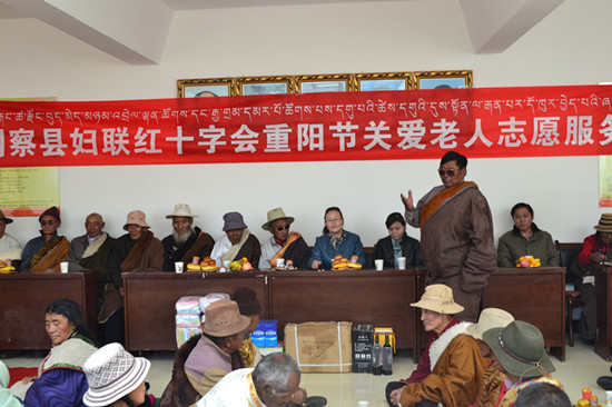 活动现场,县妇联、县红十字会的负责人和工作人员为现场的老人们端茶倒水切蛋糕,并与老人们亲切交谈询问生活情况。老人们极为感动异口同声地说:“瓜针切”。经协调,县藏医院的 2 名藏医作为红十字志愿者给老人们免费测血压、血糖,宣传健康知识、发放健康资料,受到现场老年朋友的欢迎和一直好评。