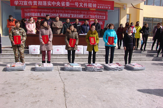 在活动现场,沙柳河镇镇政府领导作了讲话,对社区广大农牧民妇女同胞表示亲切慰问和节日祝福,并对10名贫困妇女发放了红十字慰问箱、毛毯等总价4000余元的慰问品,鼓励她们要自强不息,克服困难,用辛勤的劳动创造美好生活。